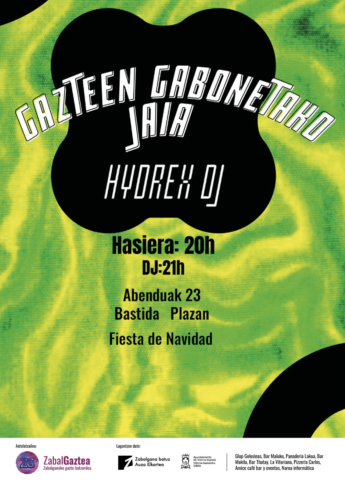 Zabalganako Gazte Batzordeak -ZabalGaztea- Gabonetako jaia antolatu du Hydrex dj-arekin Bastida plazan, 21:00etan.