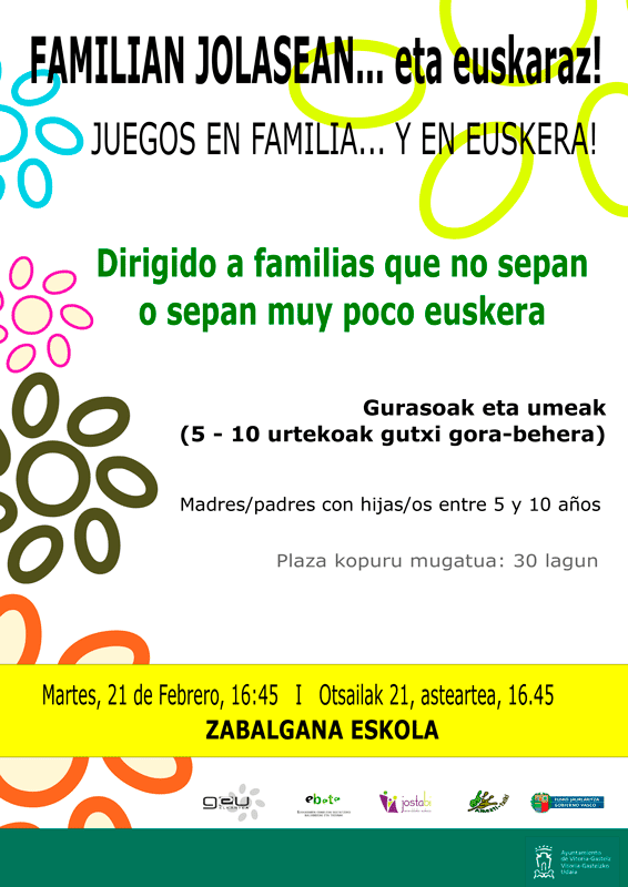 Este martes, 21 de febrero, en el CEP de Zabalgana a las 16:45 se han unas jornadas de juegos en euskera en familia, dirigido a padres y madres que no sepan euskera-o que sepan muy poco-, con hijos/as de entre 5 y 10 años más o menos.