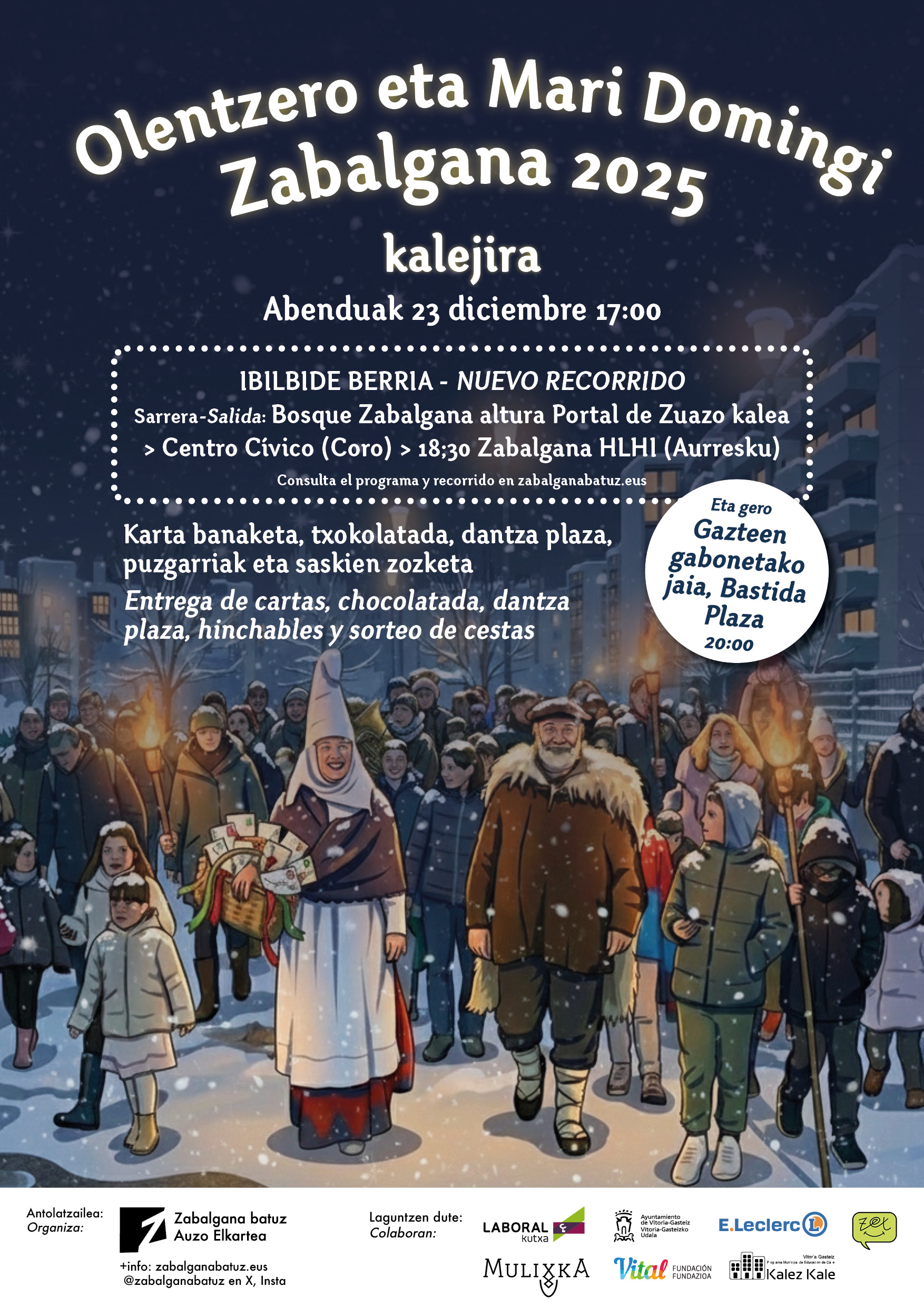 17:15h – Parada en el Centro Cívico Zabalgana y canto de villancicos a cargo del coro Urkanta y entrega de cestas a sortear